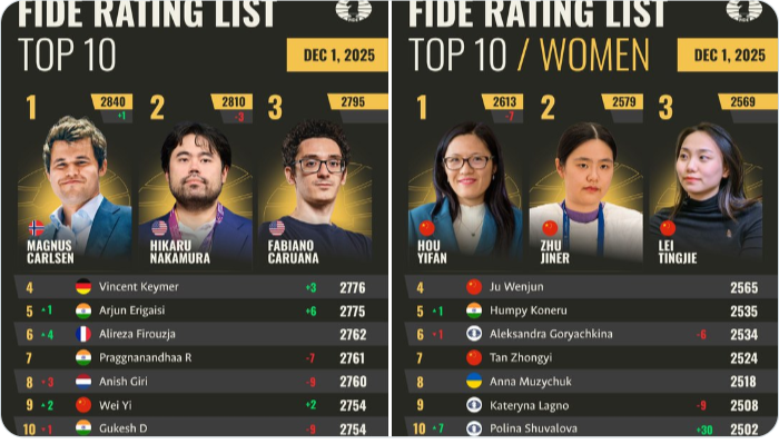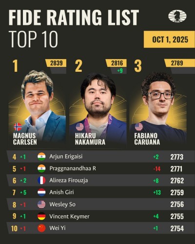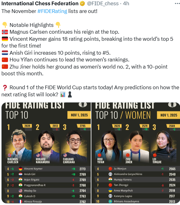 The FIDE December 2025 rating list was primarily shaped by the recently concluded World Cup in Goa, India 🇮🇳, and the Women’s World Team Championship in Linares, Spain 🇪🇸.
