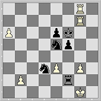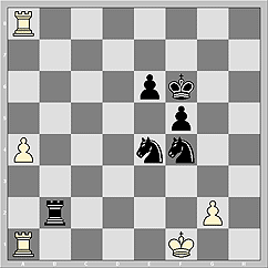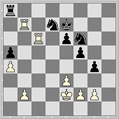 b) 36... Rh8 37. Ra7 Rh2 38. Kf1 Rh1 39. Ke2 Kd6 40. Rc2 g3!? (в случае 40... Nc5 41. Rxa5 Nfe4 42. b4 Nb3 43. Ra6 Kd5 44. f3 gxf3 45. gxf3 Rh2 46. Kd1 резвости черной конницы хватает лишь для вечного шаха) 41. Ra6 Ke7 42. fxg3 Ng4 43. Rxa5 Nde5 (не дают белых в обиду их две связанные проходные и после 43... Rg1 44. Kd3 Nde5 45. Kc3 Re1 46. Kd2! Rxe3 47. Rc3 Re4 48. Ra7 Kf6 49. b3) 44. Ra7 Kf6 45. Rc8! Rg1 46. Rf8 Kg5 47. Rg8 Ng6 48. Rag7 Rxg2 49. Ke1! (49. Kf1?? Nxe3 50. Ke1 Kg4 51. Rxg6 Kf3 с матом) 49... N4e5 50. a5 Kf6 51. a6 Nd3 52. Kf1 Rf2 53. Kg1 Nge5