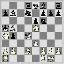 11. dxc5 Nxc5 12. Bb5. Не приносило многого 12. Nxc5 Bxc5 13. Qa4 Ke7 14. Rd1 Qb6, и о централизованном черном короле сообщу вам лишь то, что он не препятствует единению своих ладей. Не слишком убедительную победу одержали белые после 12. Bd2 Ncd7 13. Nd4 Bd6 14. Nb5 Be7 15. Qe1 a6 (15... Qa5!?) 16. Nd4 Nb6 17. Nxb6 Qxb6 18. a3 bxa3 19. Ba5 Qa7 20. Bb4!? Nd5 21. Bxe7 Kxe7 22. Rxa3 Qc5 23. Qa1 Qd6 24. Rd1 f5 25. Nb3 Rhc8 26. Na5 Rc7 27. Bf3 Bc6 28. Nc4 Qb4 29. Rd4 Rd8 30. Rxa6 Bb5 31. Nb6 Qc5 32. Nxd5 exd5 33. Ra5 Qc1 34. Qxc1 Rxc1 35. Rd1 Rxd1 36. Bxd1 Bd3 37. h4 d4 38. Bf3 dxe3 39. fxe3 Rc8 40. Rd5 Rc2 41. Rxd3 1-0, Лпутян - Грабарчик, 2001.