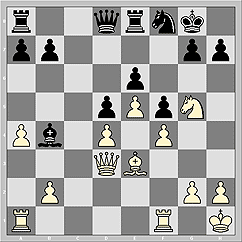 1...d5 2.c4 c6 3.Nf3 Nf6 4.Nc3 dxc4 5.a4 Bf5 6.e3 e6 7.Bxc4 Bb4 8.0-0 Nbd7 9.Qe2 Bg6 10.e4 0-0 11.Bd3 Bh5 12.e5 Nd5 13.Nxd5 cxd5 14.Qe3 Bg6 15.Ng5 Re8 16.f4 Bxd3 17.Qxd3 f5 18.Be3 Nf8 19.Kh1.