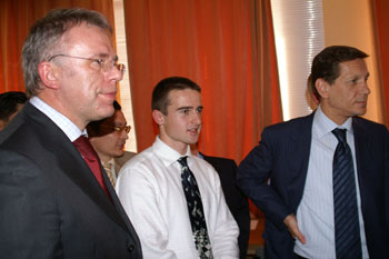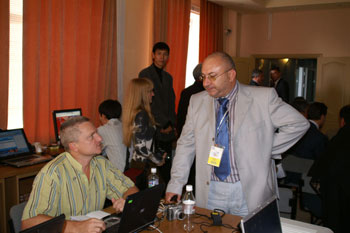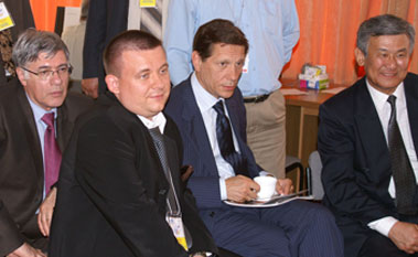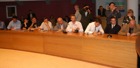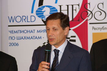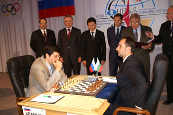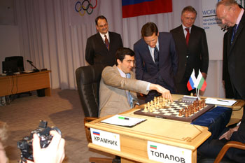 Упоминавшуюся в первом репортаже стеклянную ширму никто не стал разбирать, организаторы придумали другой ход: нас запустили на сцену и разрешили заснять волнующий момент запуска матча. Гийссен, дипломат старой школы, разумеется, не стал пускать часы: высокие гости слегка просрочили время. Но вот, толпа фоторепортеров расступилась, и высокие гости вышли на сцену. Во время зачитывания приветствий Крамник и Топалов с отсутствующими лицами сидели за шахматным столиком.
