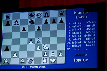 В дебюте 4-й партии случилось экстраординарное событие, когда на сцене вдруг все засверкало непривычными красками, и Топалов и Крамник вынуждены были отвлечься от проблем меранского варианта и воззриться в потолок.