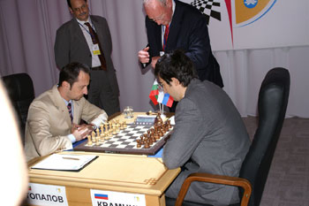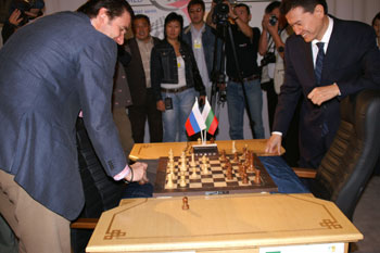 Перед туалетной инспекцией Илюмжинов и Данаилов сыграли короткую партию за столом Топалова и Крамника. Ничью в острой позиции предложил... Кто? Догадайтесь. Ответ в следующем выпуске.